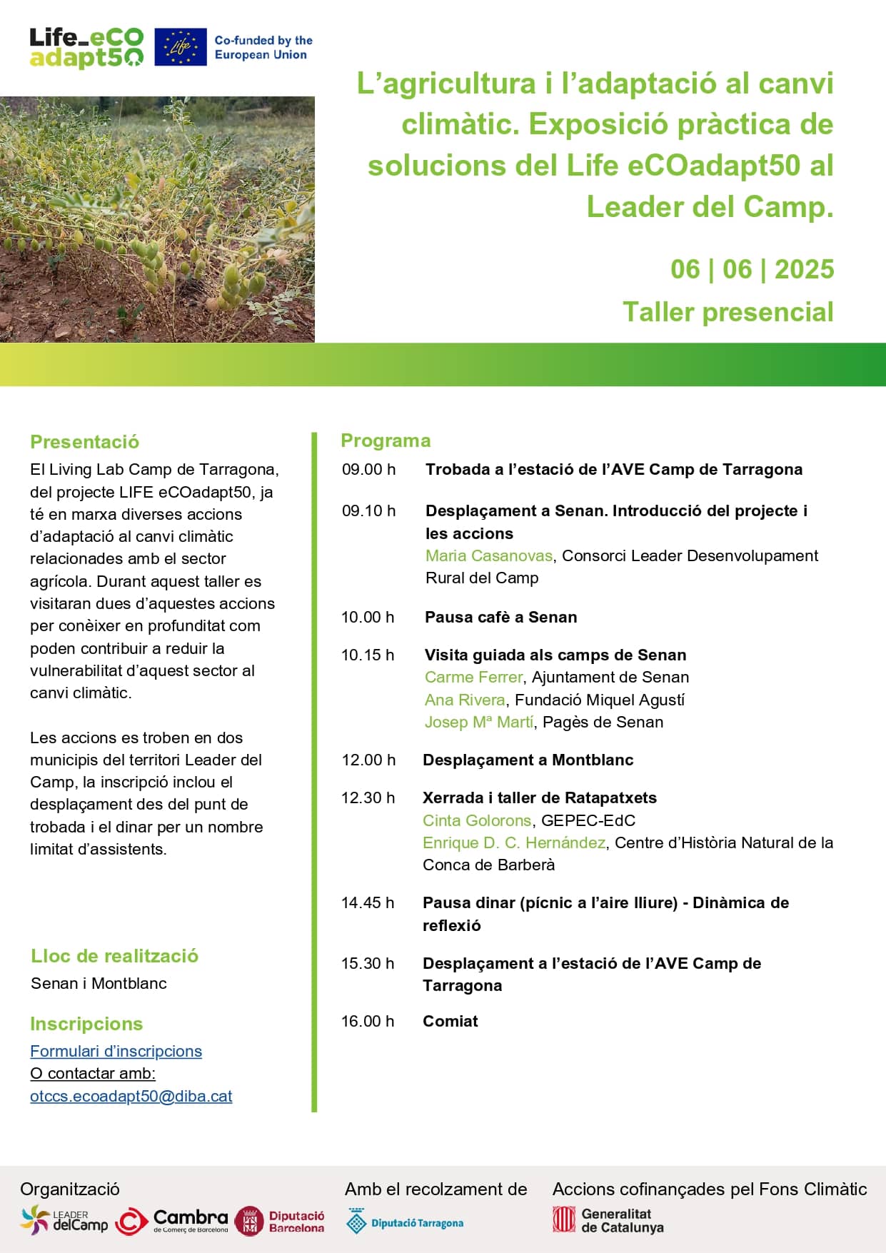 El Living Lab Camp de Tarragona, del projecte LIFE eCOadapt50, ja té en marxa diverses accions d’adaptació al canvi climàtic relacionades amb el sector agrícola. Durant aquest taller es visitaran dues d’aquestes accions per conèixer en profunditat com poden contribuir a reduir la vulnerabilitat d’aquest sector al canvi climàtic. Les accions es troben en dos […]